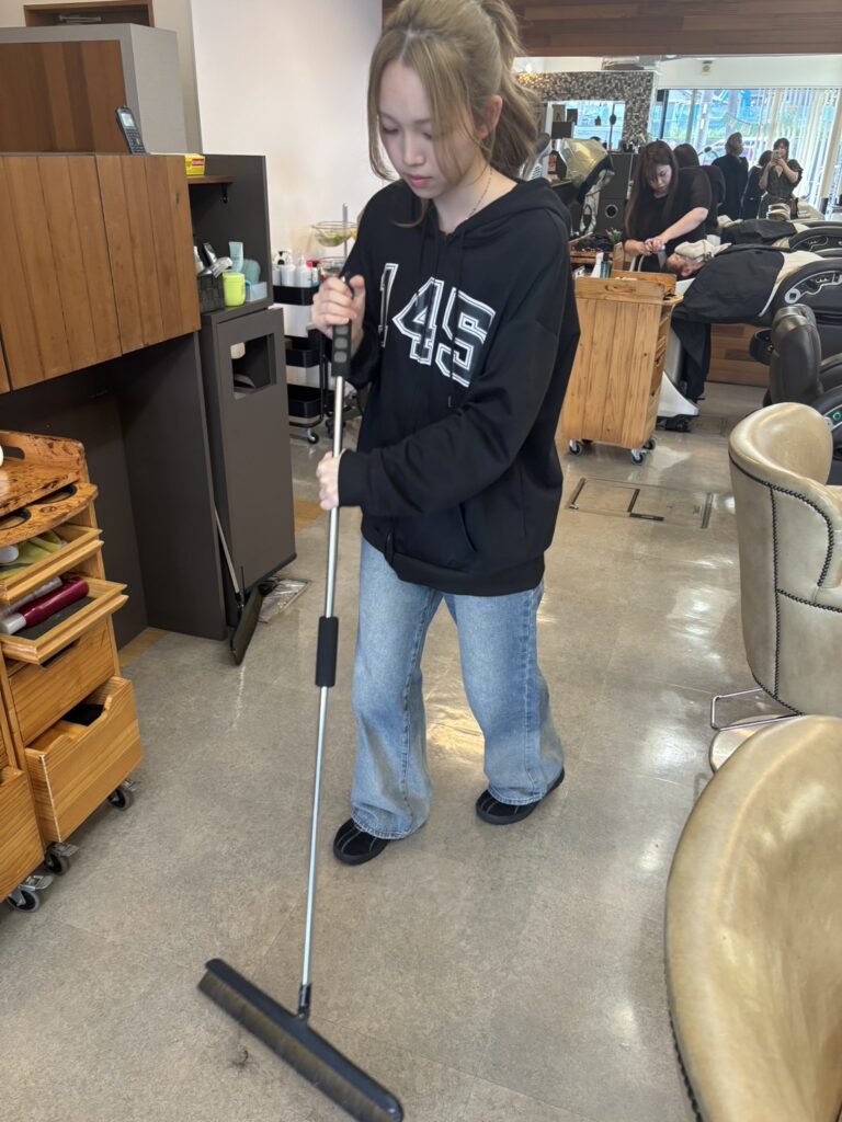 スタイリストが仕事がしやすいようにさっと掃いたり、