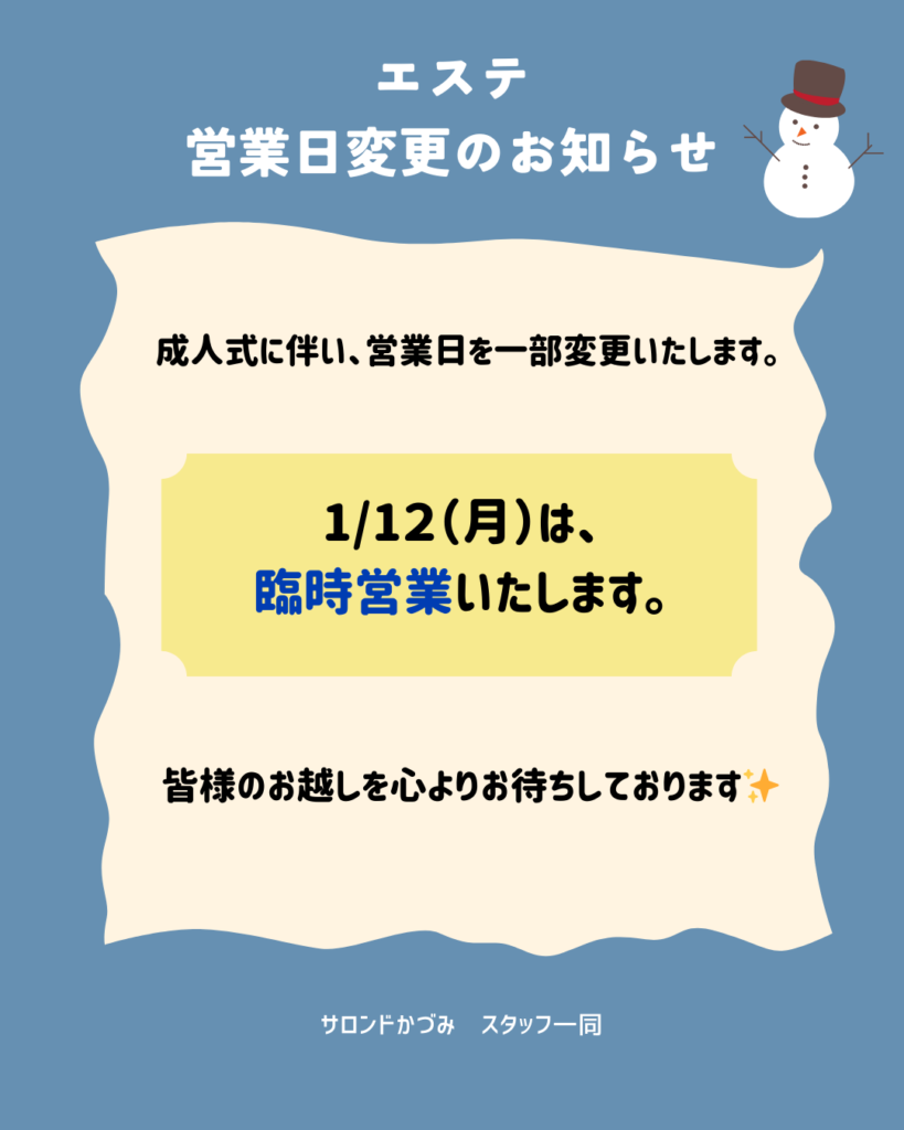 エステより💆♀️成人式に伴う営業日変更のお知らせ📢